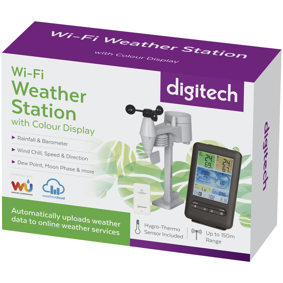 Get your own local weather forecast with this professional Wi-Fi weather station. The feature-rich system is supplied with a wireless 5-in-1 outdoor sensor to measure rainfall, wind speed, wind direction, temperature, and humidity, as well as a high-precision hygro-thermo sensor to measure humidity and temperature. Both sensors send data by a low power radio frequency signal (917MHz band) to the multi-colour main display unit up to 150m away (line of sight).